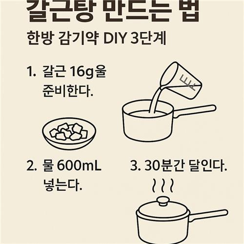안녕하세요! 몸이 으슬으슬할 때, 약국에 달려가기보다는 집에서 손쉽게 만들 수 있는 한방 감기약 '갈근탕'에 대해 소개해드리려고 해요. 감기 초기증상에 효과적인 갈근탕은, 따뜻한 성질의 한약재를 중심으로 만들어져 몸을 데워주고 코막힘, 두통, 오한 등을 완화시켜 준답니다. 이번 글에서는 직접 집에서 갈근탕을 만드는 간단한 3단계 방법을 중심으로, 필요한 재료부터 복용 팁, 주의사항까지 친절히 안내드릴게요. 천천히 따라오시면서 건강한 한방 생활, 함께 시작해봐요!