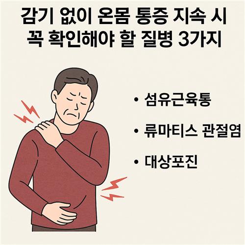 요즘처럼 날씨 변화가 큰 시기에는 몸이 자주 피곤해지고 여기저기 쑤시고 아픈 느낌이 들기 마련이죠. 그런데 감기 증상은 없는데도 온몸의 통증이 오래 지속된다면, 단순한 피로가 아닐 수도 있습니다. 오늘은 감기와 비슷하지만 감기와는 다른, 몸살처럼 아픈 통증이 계속된다면 의심해봐야 할 질병 3가지에 대해 알려드릴게요. 지금 내 몸이 보내는 신호, 무심코 넘기지 마세요!