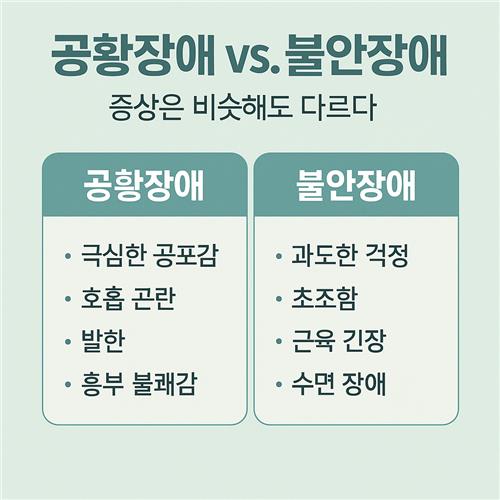 | 대표 증상 | 심계항진, 질식감, 죽음에 대한 공포 | 과도한 걱정, 불면, 신체 긴장 |