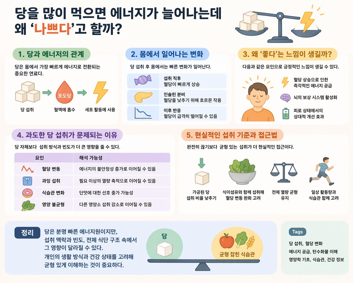 따라서 “당이 좋다/나쁘다”라는 단순한 구분보다는, 섭취 맥락과 빈도, 전체 식단 구조 속에서 이해하는 접근이 더 현실적인 해석으로 볼 수 있다.
