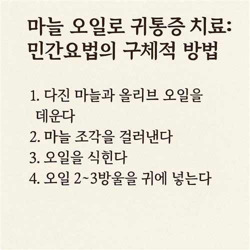 ⚠️ 주의: 마늘 오일은 보조요법일 뿐이며, 증상이 심하거나 오래 간다면 전문 치료가 필요합니다.