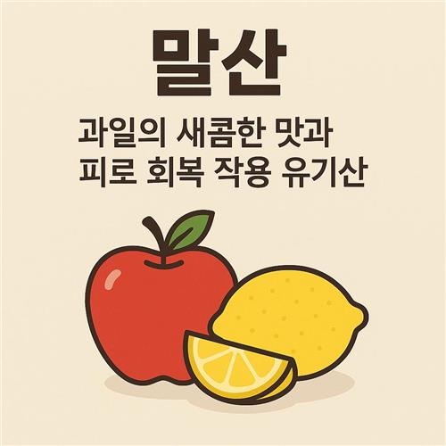 과일을 한입 베어 물었을 때 느껴지는 상큼한 새콤함, 알고 보면 그 뒤에는 다양한 유기산이 숨어 있습니다. 그중에서도 말산은 과일의 맛을 결정할 뿐만 아니라 우리 몸의 에너지 대사와 피로 회복에 중요한 역할을 하는 성분인데요. 이 글에서는 말산이 어떤 특징을 가진 유기산인지, 과일 속에서 어떻게 존재하는지, 그리고 건강과 피로 회복 측면에서 어떤 도움을 줄 수 있는지까지 천천히 정리해 보려고 합니다. 최대한 쉽게 풀어 쓰고, 일상에서 어떻게 활용할 수 있을지까지 함께 다뤄볼게요.