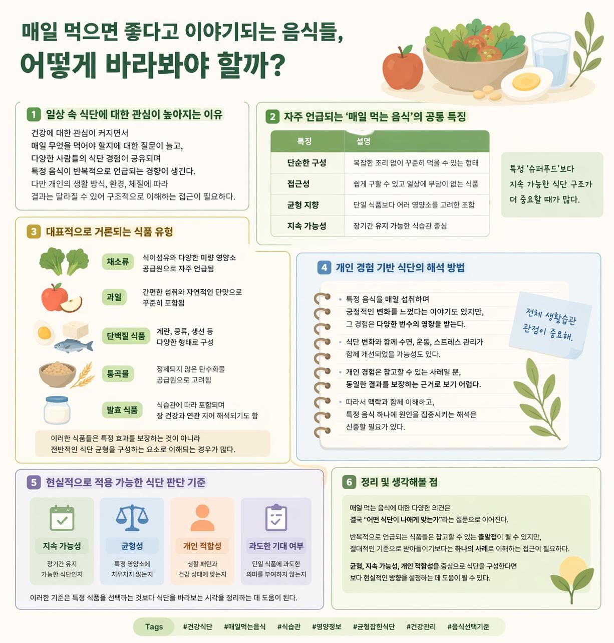 균형, 지속 가능성, 개인 적합성을 중심으로 식단을 구성한다면 보다 현실적인 방향을 설정하는 데 도움이 될 수 있다.