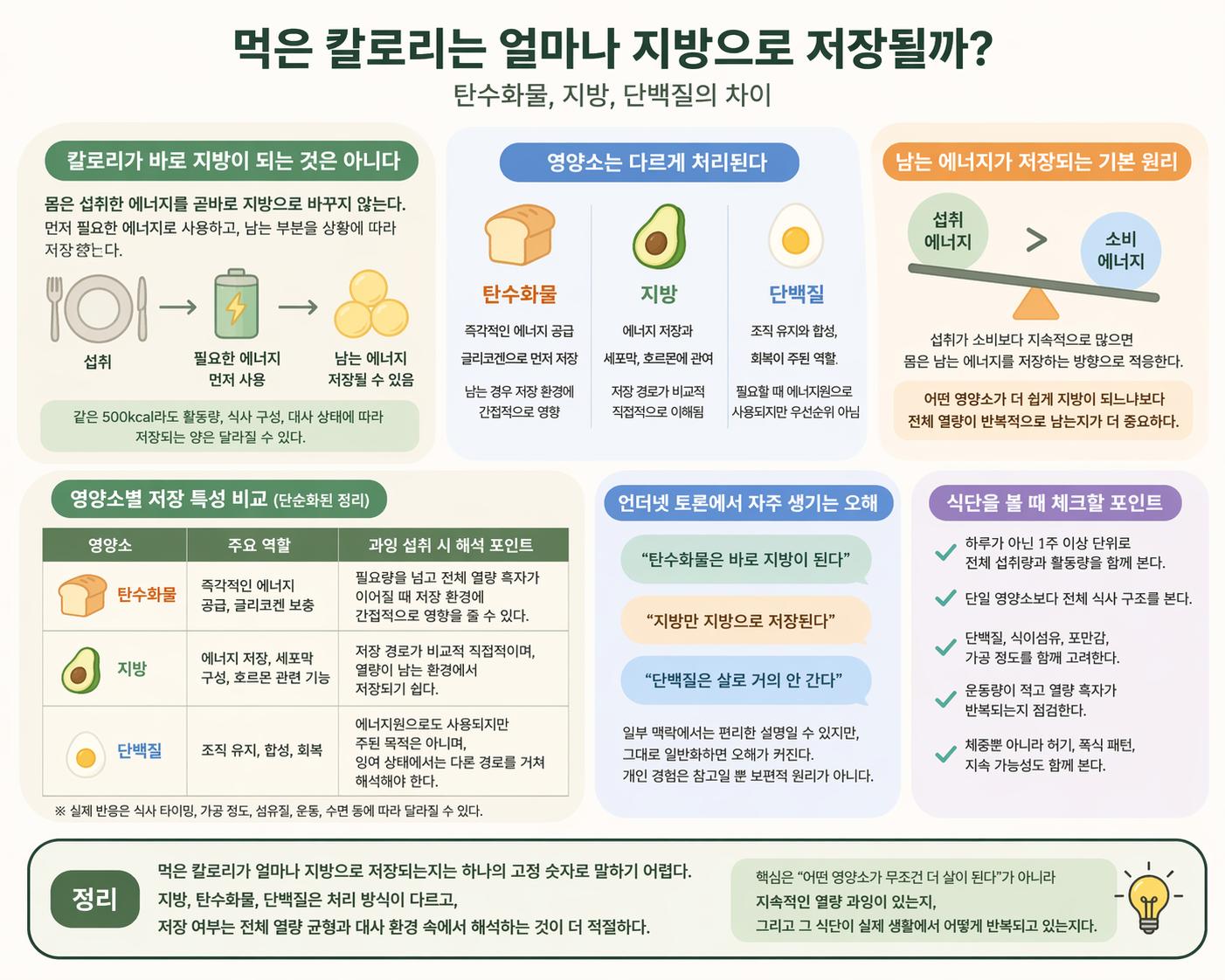 중요한 점은 “어떤 영양소가 더 쉽게 지방이 되느냐”보다, 전체 열량이 반복적으로 남는 상태가 형성되는가를 함께 봐야 한다는 것이다.