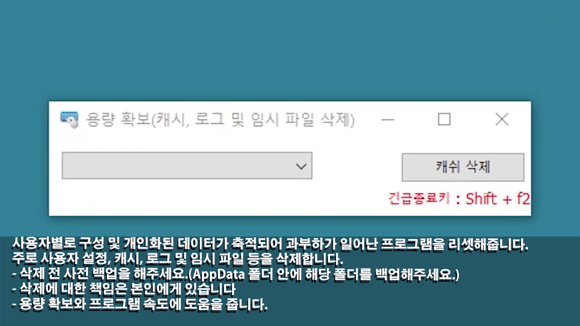 #기본프로세스 프로그램 실행 - 대상 선택(셀렉트 박스) - 캐쉬삭제 #방식 사용자별로 구성 및 개인화된 데이터가 축적되어 과부하가 일어난 프로그램을 리셋해줍니다. 주로 사용...