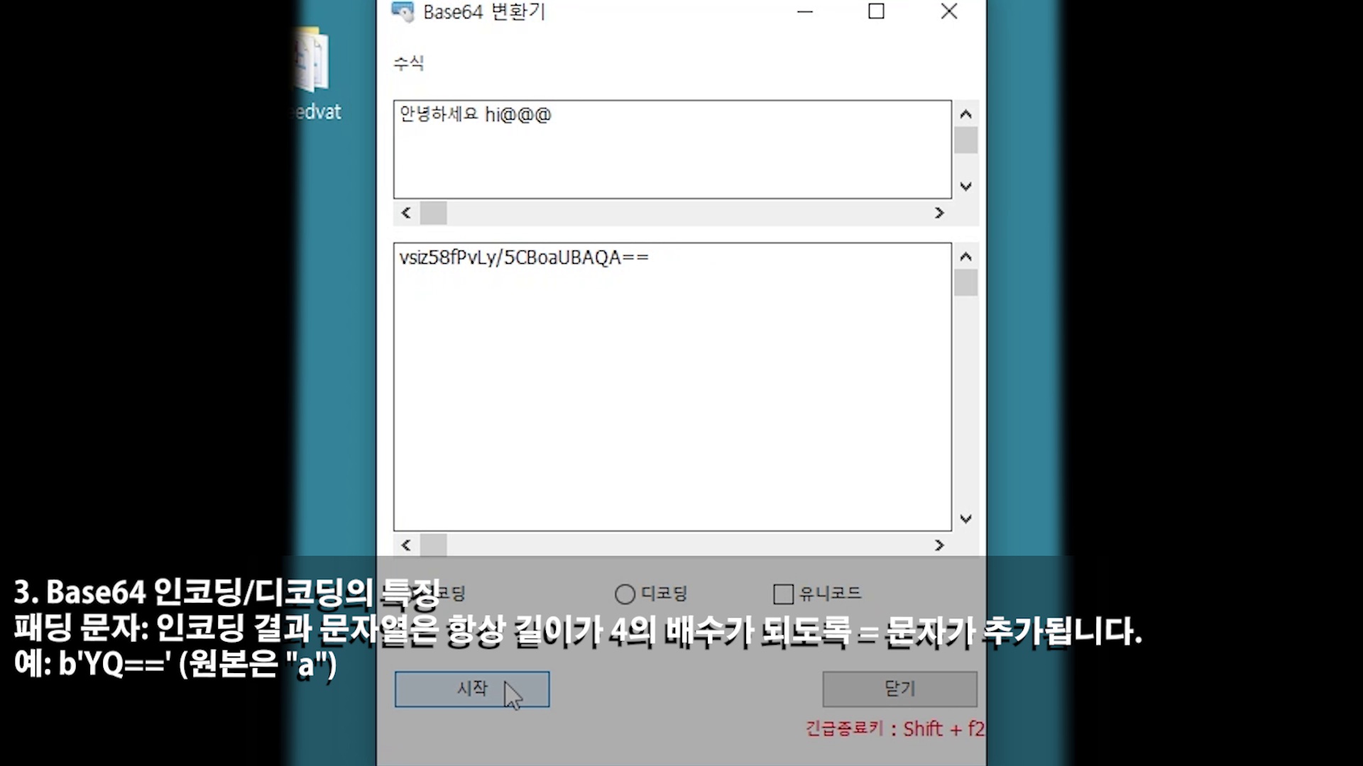 패딩 문자: 인코딩 결과 문자열은 항상 길이가 4의 배수가 되도록 = 문자가 추가됩니다.