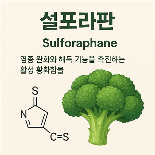 | 설포라판 | 브로콜리·브로콜리 새싹, 양배추, 케일 등 십자화과 채소 | NRF2 활성, 해독 효소(Phase 2) 유도, 항산화·염증 조절, 세포 보호 | 해독·항산화 시스템을 전반적으로 업그레이드하는 방향의 작용, 상대적으로 적은 양으로도 높은 효과 가능성 | 임상 근거는 아직 제한적, 농축 보충제는 장기 안전성·용량에 대한 연구 필요 |