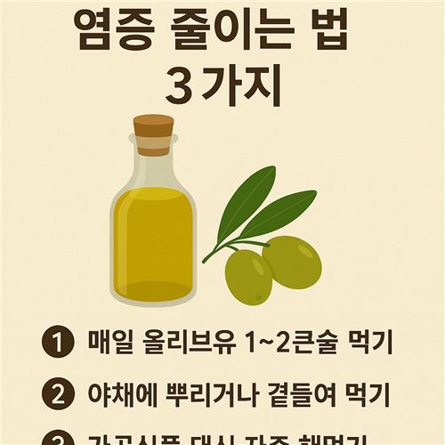 식사 전반을 항염 방향으로 묶어야 효과가 누적됩니다. 올리브유는 바꾸기 쉬운 첫 단추입니다.