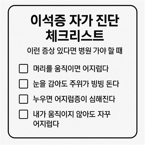 이석증, 어지럼증, 자가진단, 이비인후과, 어지럼증 원인, 귀 질환, 이석 정복술, 건강 체크리스트, 뇌질환 구분, 어지럼증 치료