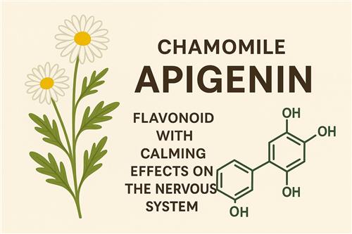 | 아피제닌 (Apigenin) | 플라보노이드 | GABA 수용체 및 벤조디아제핀 수용체와 상호작용할 가능성이 보고되었으며, 항산화·항염 효과와 함께 진정·불안 완화에 기여할 수 있는 성분으로 연구 중입니다.:contentReference[oaicite:3]{index=3} |