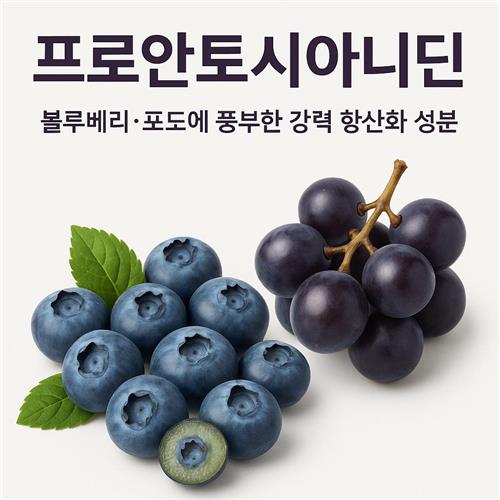 | 프로안토시아니딘 | 폴리페놀계 항산화 성분, 혈관·피부·결합조직 보호에 도움, 강력한 라디칼 소거 능력 | 블루베리, 포도씨, 크랜베리, 피크노제놀, 카카오 등 |